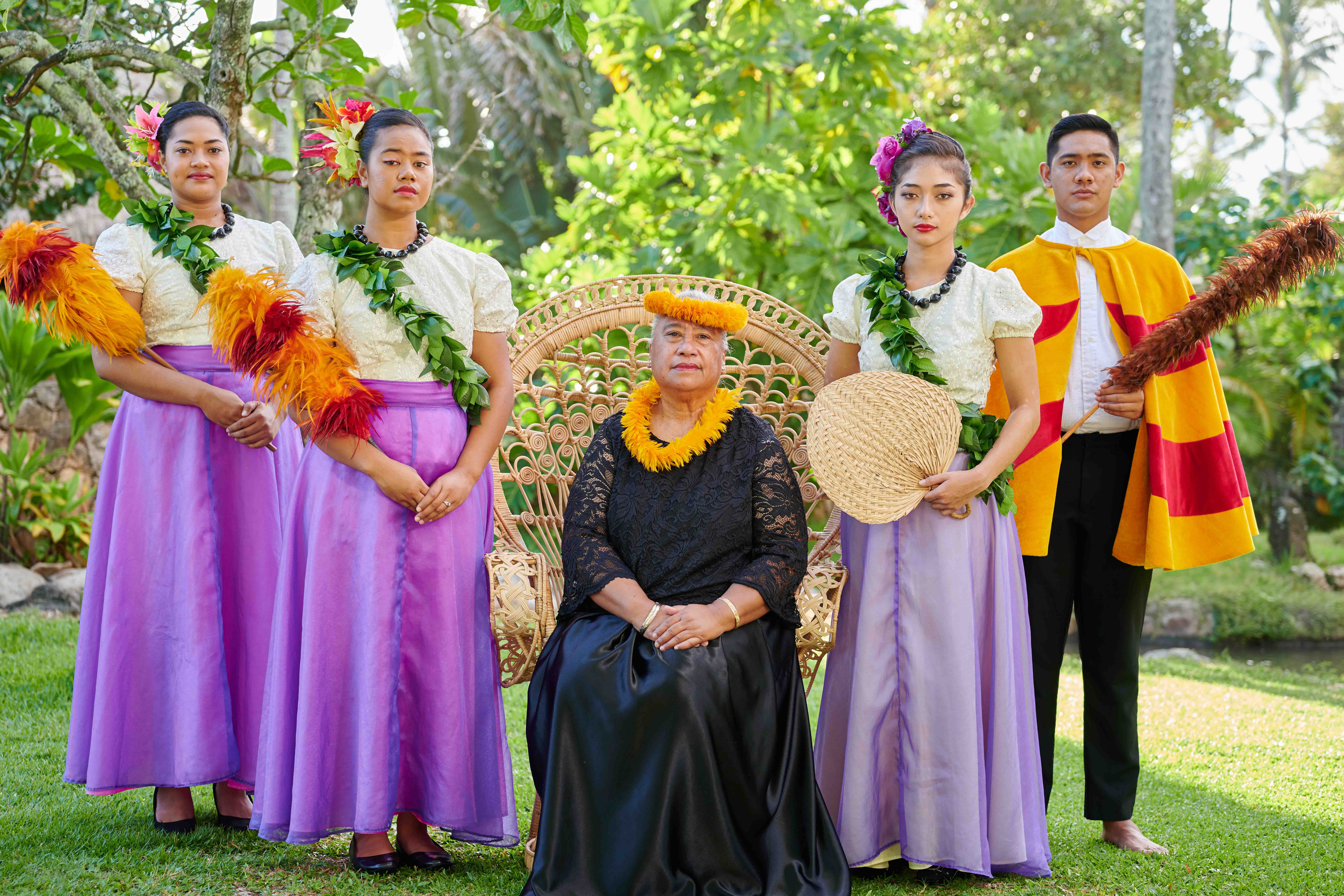 Our award winning Aliʻi Lūʻau is a royal celebration of our cultural heritage which includes the Royal Court procession, presentation of the imu (underground oven), delicious traditional food, and lively Hawaiian entertainment held in a covered outdoor venue against a background of waterfalls and lush gardens - Flower lei greeting at the lūʻau